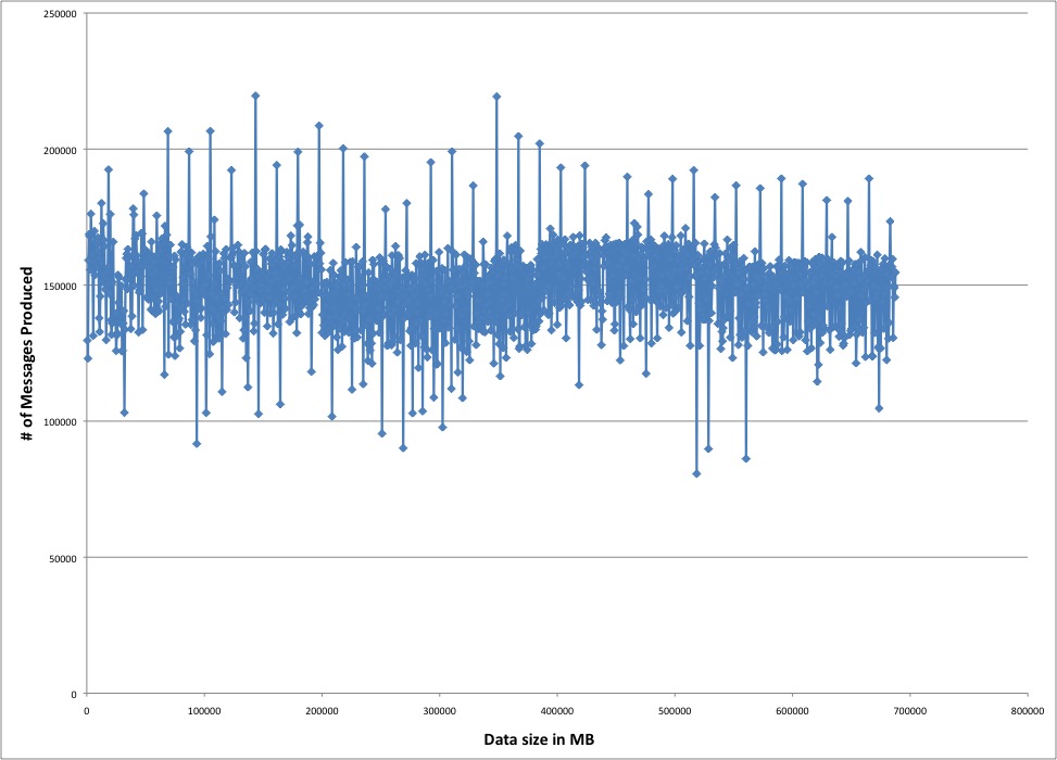 The following tests give some basic information on Kafka throughput as the number of topics, consumers and producers and overall data size varies. Since Kafka nodes are independent, these tests are run with a single producer, consumer, and broker machine. Results can be extrapolated for a larger cluster.