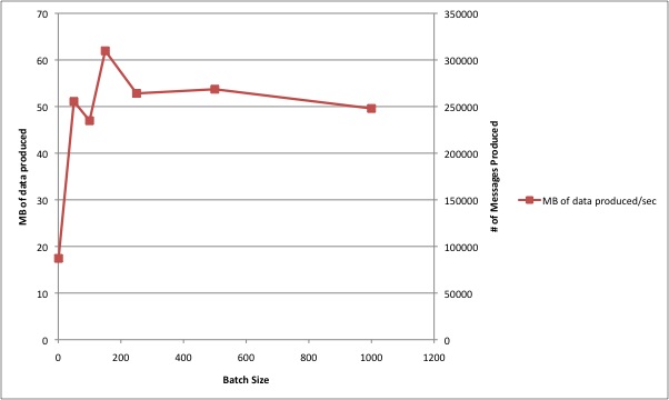 We can push about 50MB/sec to the system. However, this number changes with the batch size. The below graphs show the relation between these two quantities.