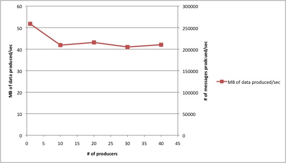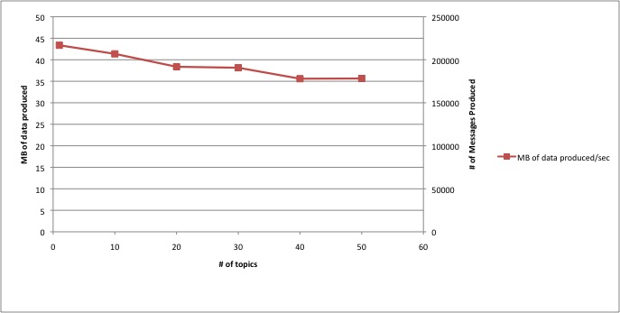 Based on our experiments, the number of topic has a minimal effect on the total data produced. The below graph is an experiment where we used 40 producers and varied the number of topics